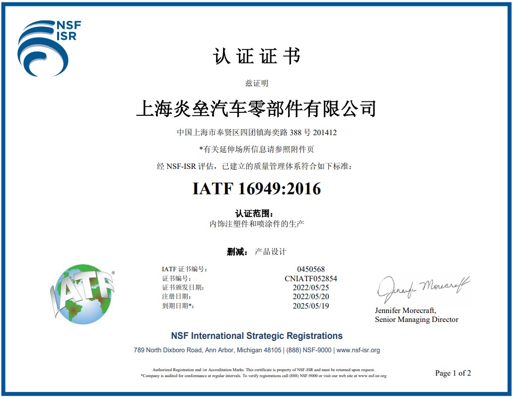 2019年5月份获得了ITAF/TS 16949质量管理体系认证证书。
